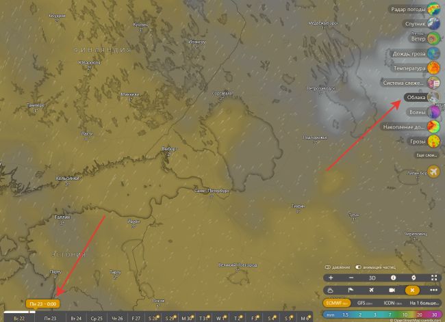 Заходим на сайт www.windy.com, выбираем там раздел Облака и ползунком смотрим прогноз на ночь